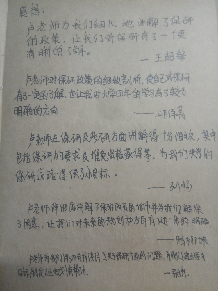 卢艳花教授为同学们介绍了近年来的推免政策,并从名额分配、候选人的产生、面试的方式、成绩的计算、填报志愿、导师选择等环节详细解读了推免流程,以便大家对推免工作有整体的认识。卢艳花还详细为同学们介绍了公司的一级学科博士点、二级博士点和硕士点的学科特色、团队力量以及相应的招生类别。她重点针对2014年开始的推免名额不分“学术硕士”和“专业硕士”,不限定“保内”和“保外”的推免政策的调整,给出了中肯的建议,希望能帮助同学们走出盲目追求“保外”、贸然选择的误区,建议同学们读研更应该看重学科专业的实力和影响力,希望能帮助同学们规避新政策下“自由保外”的陷阱。