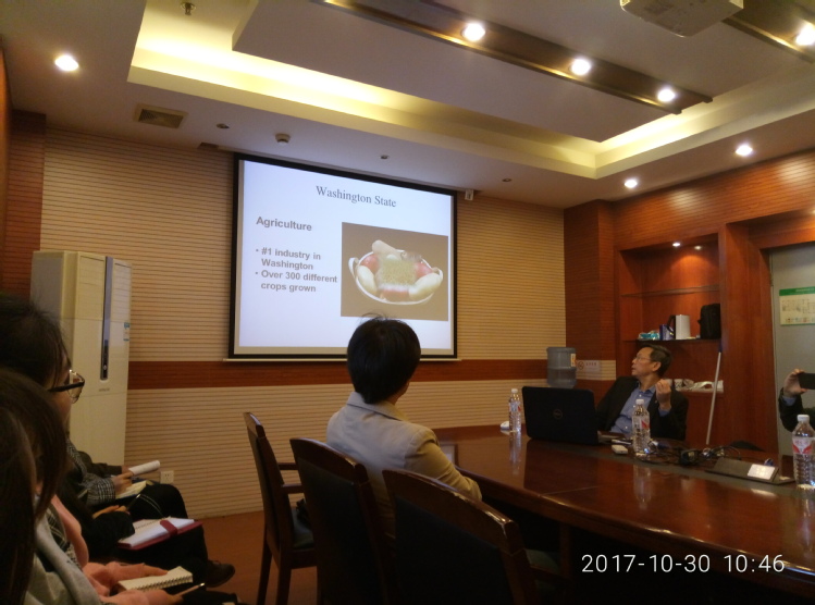 交流过程中,唐炬明教授介绍了华盛顿州立大学的生活和体系建设,美国农业、食品工业以及食品科学与工程专业的分布情况,以及近期在华盛顿州立大学所做的食品工程中主要高新技术研究方向及进展,并就研究生联合培养、科研合作等进行了深入交流。唐教授主要从事食品加工技术、微波杀菌技术、农产品采后虫害控制等研究,目前主要的研究方向为食品过程工程中的热加工、干燥、包装材料及微波处理等,其主持研制的微波商业灭菌生产装备与技术于2009年获得了美国食品药品监督管理局(FDA)的批准,这可能引起食品杀菌技术方面的巨大革新。唐教授讲述了传统的热杀菌技术、微波及射频加热原理、及其主持研制的微波商业灭菌技术的研发及通过FDA审批的过程,并对研发过程中利用计算机模拟技术研究微波灭菌后产品品质变化的实验进行了详细的分析。