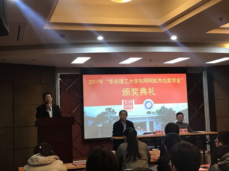 田守生表示作为东阿阿胶和华东理工首次合作的见证者和参与者,感谢华东理工师生对公司的关注和帮助,他还介绍了东阿阿胶近年的飞速发展,过去和现在的面貌对比,公司销售额迅猛增长与技术支撑分不开,并对东阿阿胶在原料、工艺、技术、质量和功效上的独特性进行了讲解,东阿阿胶的企业使命是“寿人济世”,望获奖同学学业进步,欢迎同学们加入东阿阿胶。