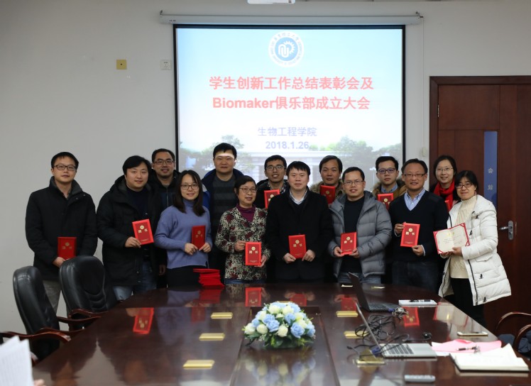 生物工程公司于2018年1月26日下午在奉贤老员工活动中心401室召开“员工创新工作总结表彰会”及Biomaker创新俱乐部成立大会。会议由学工委主任吴蓉主持。公司教学副经理王启要教授,大创负责人叶蕊芳教授,以及创新工作指导教师,创新活动相关员工参加会议。