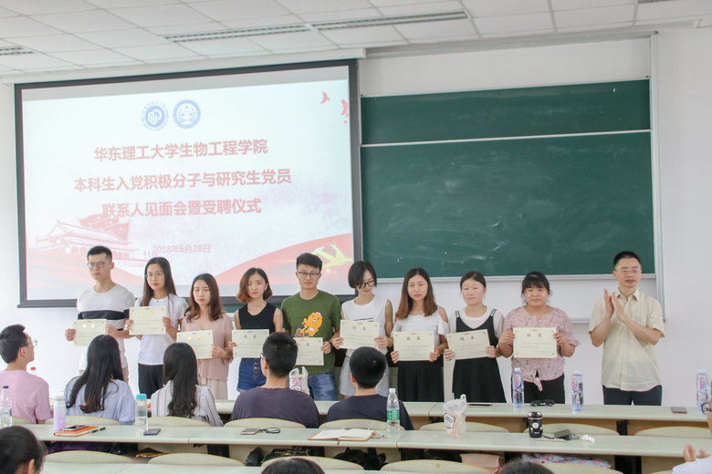 陆兵为14名研究生党员培养联系人代表颁发了聘书并作总结发言。陆兵希望研究生党员能充分发挥优势,在入党积极分子的思想引领和学习成长过程中能言传身教,为入党积极分子带来积极影响的同时,也不要忘记当年入党时的初心和使命。对于入党积极分子,陆兵鼓励大家要积极主动向研究生党员学习,不断端正入党动机,努力成长,争取早日入党,勇于承担起新时代赋予的伟大使命。