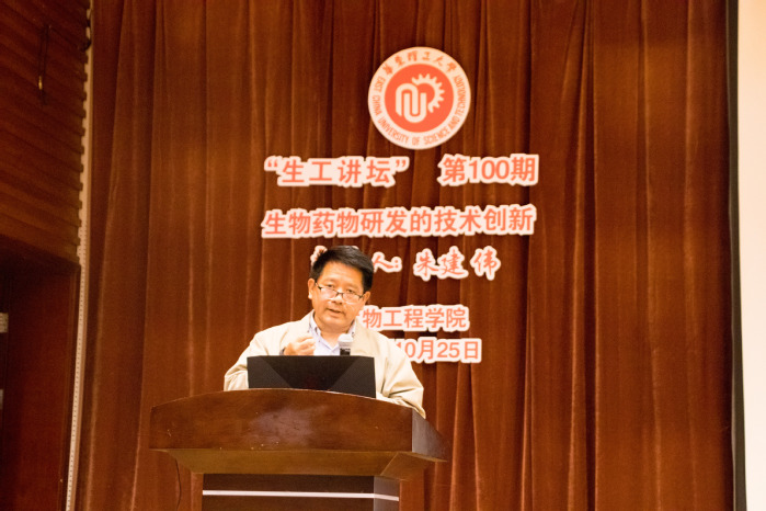 一段回顾生工讲坛12年发展历史的暖场视频拉开了活动帷幕,多位与这一品牌活动结缘深厚的师生们送上了祝贺。嘉宾朱建伟教授首先提及了与母校的缘分,在20年前庆祝母校46岁华诞之时他也是作为嘉宾前来开讲,这次再度回归母校,来到奉贤校区,感受到了年轻员工们的青春活力和华理近些年的蓬勃发展。他随后从时间维度围绕“生物药物研发的技术创新”这一主题依次展开,从解放初期的抗生素生产讲到80年代后DNA重组药物的技术革新,再到如今生物制药注册与销售数量的大幅增长、中国本土生物制药逐渐起步等方面提及生物制药产业具有的光明前景。此外,朱建伟还指出研发过程中生产的药品种类多样,但最终得到许可上市的产品往往只有一种,可见淘汰率之高,因此科学界一直致力于寻求更快更好的方法去筛选出效果不太好的药物。而在这一领域,朱建伟团队的基因定向放置技术与双抗技术对于筛选效率的提高有很大帮助。