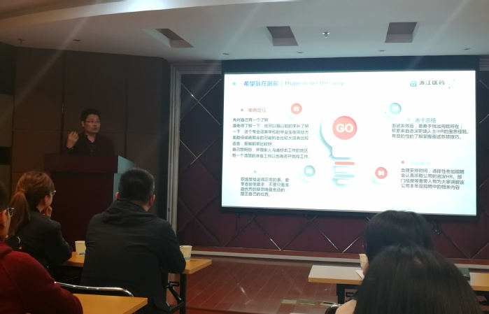 本次活动首先邀请了上海透景生命科技股份有限公司应用工程部总监张晓锋从“我是怎么面试”的角度,为准研究生们分享了在面试过程中需要注意的事项。随后,上海透景生命科技股份有限公司人事部容妍洁总经理以“求职经验分享”为题,从简历书写到面试细节问题等方面为大家做了相关经验分享。最后,浙江医药股份有限公司招聘主任唐仁喜总经理以“职步向前·相约在浙”为题,从秋招和春招的重要性、简历制作技巧和如何应对面试等方面,从企业角度为员工提供了求职参考。活动由伟德体育研究生兼职辅导员阳大海副教授主持,2016级研究生兼职辅导员辛秀娟副教授和部分准毕业研究生和本科生参加了本次活动。