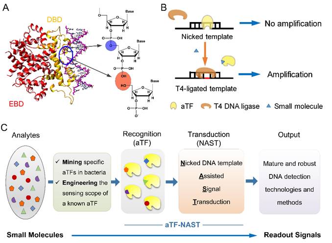 微生物是认知生命活动规律的重要源头,也是合成生物学实现“格物致知”到“建物致知”再到“建物致用”所需要的具有特定功能的生物“元/器件”的重要发掘对象。Bevictor伟德官网生物反应器工程国家重点实验室张立新教授带领的团队首次发现別构转录因子(allosteric transcription factor,aTF)在体外能够结合缺刻的DNA结合序列,并进一步利用这一发现建立全新的小分子检测方法。相关工作于11月28日以长文(Research Article)的形式发表在Science子刊Science Advances。文章链接:http://advances.sciencemag.org/content/4/11/eaau4602