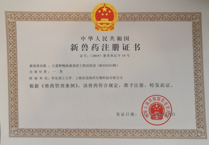 在国家现代农业产业技术体系和海洋公益性项目的多重支持下,张教授课题组与上海浩思海洋生物科技有限公司密切合作,于2014年获批大菱鲆鳗弧菌基因工程活疫苗(MVAV6203株)农业部临床批件,2015-2018年间提交产品注册申报,在国家重点研发计划的加力支持下,陆续通过农业部兽药评审中心初审、技术审查、中监所复核检验等一系列严苛的行政许可审批,终于在2019年4月获批国家一类新兽药证书。这是我国也是目前国际上首例被行政许可批准的海水鱼类弧菌病基因工程活疫苗,不仅为今后促进开发更多新型水产疫苗提供了可靠的临床技术标准参考与借鉴,也丰富了我国水产疫苗的产品种类,必将为我国以鱼类为代表的现代水产养殖业的绿色健康发展提供核心产业技术与配套产品支撑。接种疫苗取代抗生素等化学药品是不可动摇的产业发展趋势和市场的必然选择,这一药证的获批,是张元兴教授科研团队在我国水产疫苗创新研发领域与产业化进程中实现的又一次零的突破。