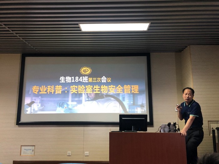 5月23日下午,生物184班本学期第三次班会于奉贤校区实验7楼601进行,班会由班导师马悦主持,主题为病原微生物实验室的生物安全管理。