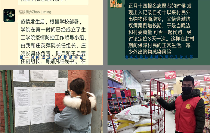 华东理工老员工物工程公司党委积极响应,根据公司部署,第一时间成立以赵黎明书记、庄英萍经理为组长的疫情防控小组。陆兵副书记亲自书写名为《打赢抗击病毒战之我见》的文章,与全公司党员同志交流。鲁华生物技术所的研究生党支部在线上召开组织生活会;组织并动员支部成员捐款、捐物;拍摄疫情防控宣传视频;在家乡参加志愿者服务,默默奉献,如被称为“全村希望”的王明睿同志、与居委会一起共同张贴宣传标语的邓思敬同志等。大家始终贯彻“把初心落在行动上、把使命担在肩膀上”,积极为疫情抗击奉献自己的一份力量。