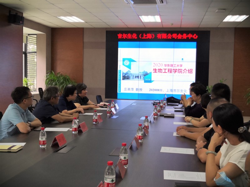 8月11日,生工公司经理庄英萍携应用生物学系主任吴海珍、生物工程系主任白云鹏等一行五人来到位于紫竹国家高新技术产业开发区的吉尔生化(上海)有限公司进行实践基地挂牌与交流。公司董事长徐红岩先生、总经理周敏女士、公司员工现任销售总监的魏欣先生及各部门主管等出席基地挂牌仪式与交流会。