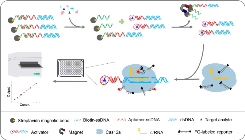 生物反应器的细胞优化、工艺和工程放大、甚至临床疾病诊断等多个场景都离不开嗅觉高效灵敏的生物传感与检测等通用平台技术。聚焦“绿色智能制造”这一目标,公司生物反应器工程国家重点实验室(以下简称国重室)张立新教授团队及其合作者利用CRISPR-Cas12a技术建立了针对小分子化合物的简单快速、灵敏、高通量和低成本检测平台,简称CaT-Smelor猫嗅技术(Nat Commu, 2019, 10: 3672)。为进一步扩展其通用性,该研究耦合CRISPR-Cas12a与核酸适配体,开发了升级版第二代检测平台CaT-Smelor 2.0,大幅扩展了底物检测类型,还可实现蛋白质等多种检测物的传感与高效检测。相关研究论文“A versatile biosensing platform coupling CRISPR–Cas12a and aptamers for detection of diverse analytes”于9月6日在Science Bulletin期刊在线发表(链接: https://doi.org/10.1016/j.scib.2020.09.004)。