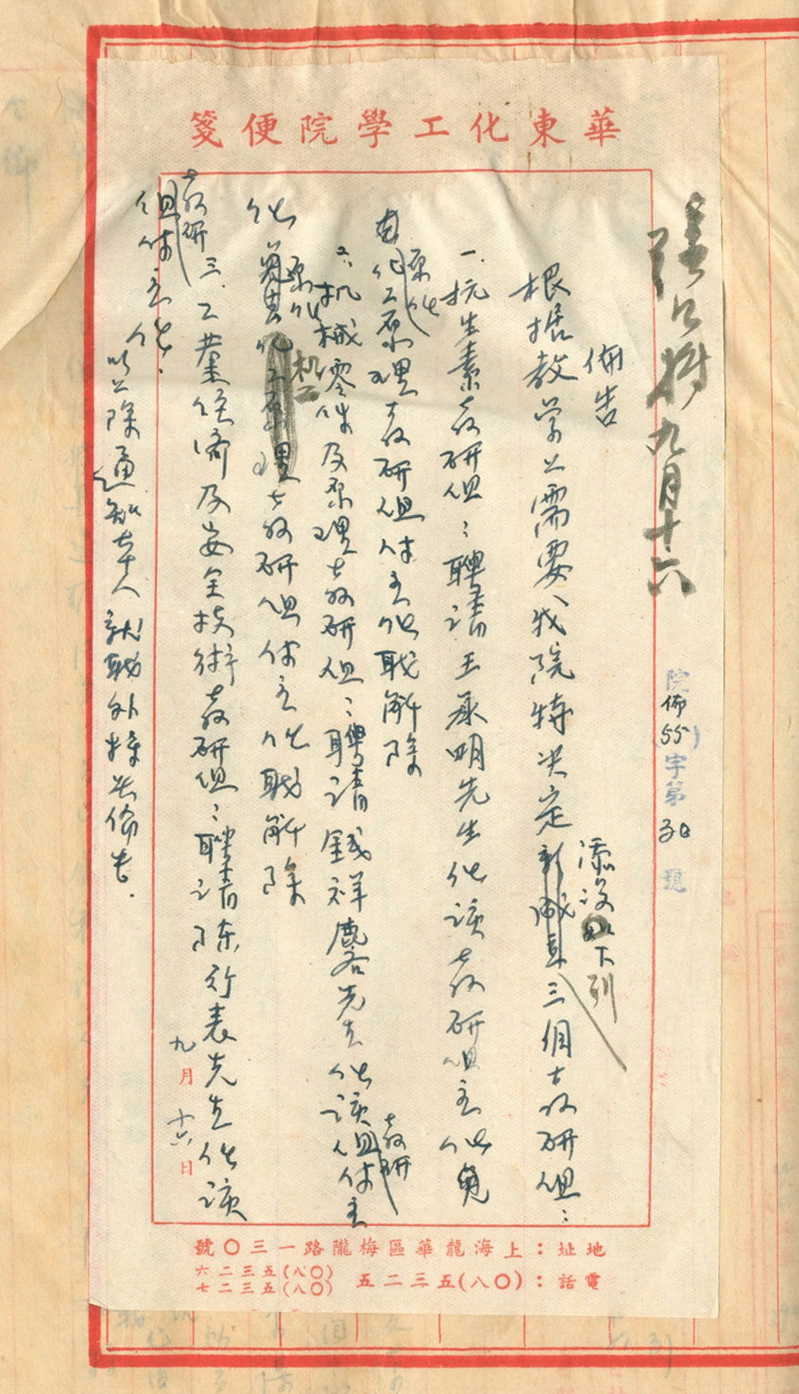 由于当时中国急需抗生素生产技术人才,化工部医药局提出要加速建设抗生素制造工学专业,早出人才。经公司研究决定和医药局同意将化学制药工学专业1953年和1954年进校的员工抽调部分转入抗生素制造工学专业学习,因此华东化工公司抗生素制造工学专业在1957年就有首届毕业生,这也是中国自己培养抗生素制造工程技术人才的开始。