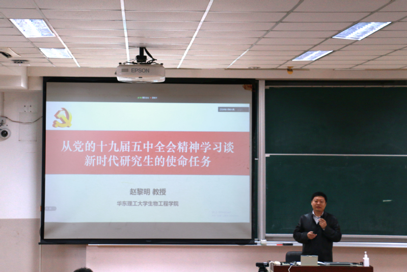 赵黎明教授从十九届五中全会精神、大学精神和大学思维以及新时代生工研究生的使命任务三个方面展开本次的思政课。他向同学介绍了十九届五中全会的主要精神内容、时代背景、历史及现实意义,特别就科技创新和人才强国战略结合公司学科特色和时代使命,并运用许多实际案例来鼓舞和激励青年学子们努力学习、勤奋求实、勇担使命,为实现第二个百年奋斗目标努力奋斗。赵黎明教授告诉研究生新生们,要承担伟大使命、奋力成才,必须具备大学精神和大学思维,他引用钱旭红院士“单靠知识改变不了命运,改变命运需要用思维架构起知识,从而支撑起足够高度和强度的人生大厦”的名言,指导同学们要学会运用逻辑思维、形象思维和格局思维来客观看待问题、分析问题和解决问题。研究生是国家的精英,应培养通过历史的维度、横向的维度、实践的角度看待和分析问题的能力,要增强“四个意识”、坚定“四个自信”、务必做到“两个维护”。