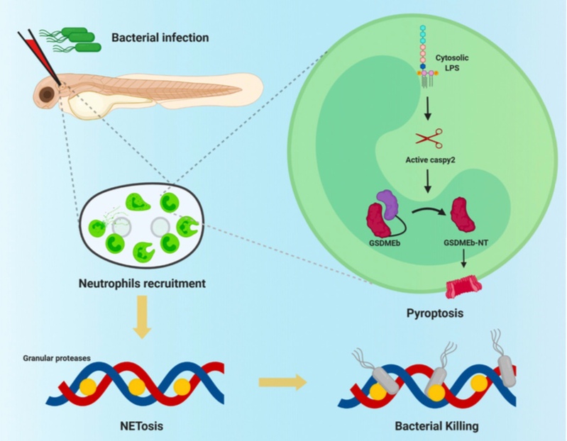 中性粒细胞是血液中的一种白细胞,当机体出现感染或炎症时,中性粒细胞就会聚集在有炎症的地方开始吞噬细胞和细菌,帮助机体抵御感染等疾病的发生。近日,公司伟德体育刘琴教授团队在鱼类细胞焦亡调控中性粒细胞胞外陷阱(Neutrophil Extracellular Traps,NETs)发生分子机制方面取得新的进展。3月12日,相关研究成果以“Pyroptosis Mediates Neutrophil Extracellular Trap Formation during Bacterial Infection in Zebrafish”为题,在线发表于美国免疫学会会刊《The Journal of Immunology》。