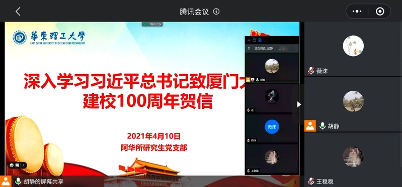 国重室研究生第三党支部、国重室研究生第五党支部、阿华所研究生党支部、鲁华所研究生第一党支部、鲁华所研究生第二党支部、本科徐汇第二党支部全体成员认真学习了习近平总书记致厦门大学建校100周年贺信,贺信内容引发了党员们热烈讨论,纷纷表示作为科研工作者,更要学习厦门大学百年发展历程以及在发展中形成的爱国精神、自强精神和科学精神,为实现中华民族伟大复兴而奋斗,为党的百年华诞献上一份贺礼!