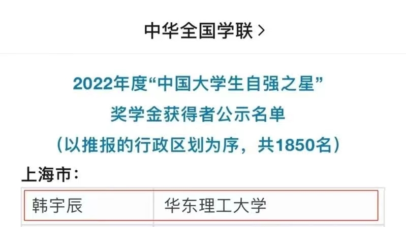 近日,由共青团中央、全国学联指导,中国青年报社、新东方教育科技集团、中国青年创业就业基金会联合举办的2022年度“中国老员工自强之星”奖学金获得者名单公示。经公司推荐、省级初评、全国评审等环节,公司2022级硕士研究生韩宇辰入选,荣获“中国老员工自强之星”奖学金。