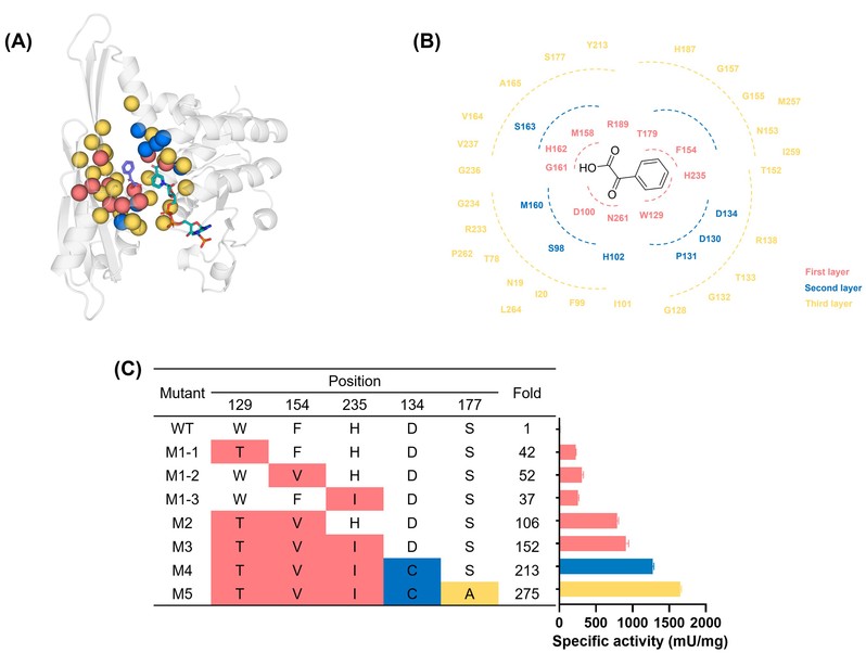 图片说明:分层改造突变位点的选择(A&B)及进化路线图(C)