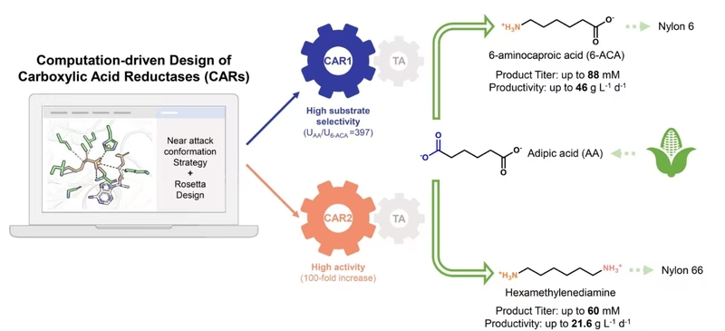 近日,公司生物反应器工程国家重点实验室许建和教授团队郁惠蕾教授课题组利用人工智能赋能的蛋白质理性设计技术重塑了羧酸还原酶的活性中心,大幅提升羧酸还原酶的活性和底物专一性,并成功应用于尼龙6和尼龙66的单体(1,6-己二胺和6-氨基己酸)的生物合成中。研究成果以“Computation-driven redesign of an NRPS-like carboxylic acid reductase improves activity and selectivity”为题,发表于Science子刊Science Advances上。
