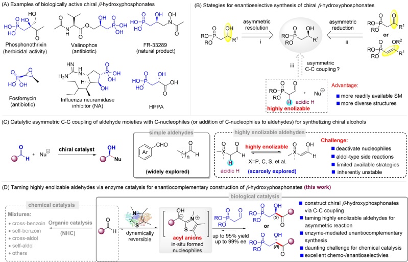 β-手性羟基膦酸/酯是一类广泛存在于医药、农药和天然产物中的优势活性骨架。传统合成方法主要依赖于酯酶或有机催化剂介导的外消旋醇或酯的动力学拆分(KR),产物的理论收率低于50%。尽管已经存在多种不对称还原方法可以用来构筑该类结构,但这些方法存在底物制备路线长、效率低等问题。近日,伟德体育张立新团队解永涛组提出了碳碳键偶联的策略用于高效构筑β-手性羟基膦酸酯——亲核试剂对高烯醇化的2-膦酸酯乙醛进行不对称加成。理论上该策略是β-手性羟基膦酸理想的合成方法(原料廉价易得、产物结构容易多样化),但确面临很大的挑战:(1)高烯醇化醛α位的氢具有较强酸性,可以导致亲核试剂的失活;(2)高烯醇化醛容易发生aldol类型的副反应;(3)缺乏有效的“驯服”高烯醇化醛的不对称合成策略;(4)高烯醇化醛自身的不稳定性。