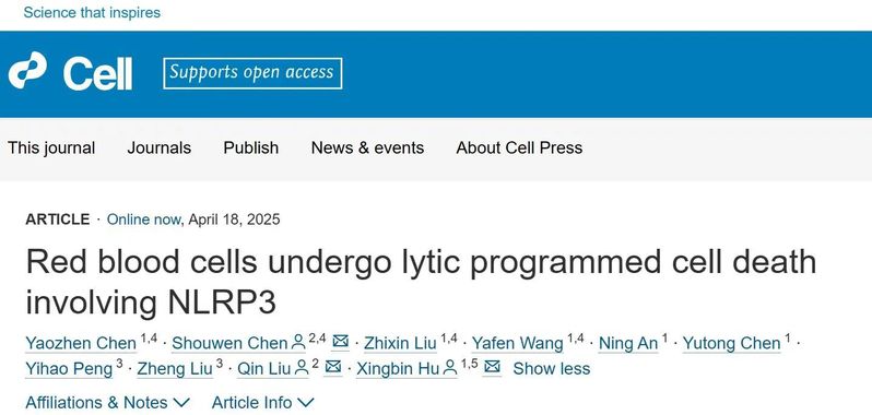 原本应该“寿终正寝”的“氧气快递员”红细胞,却纷纷意外死亡,引发的溶血性疾病,轻则导致疲劳、贫血,重则引发器官衰竭,原因何在?针对这一问题,Bevictor伟德官网刘琴教授团队联合空军军医大学附属西京医院胡兴斌副教授团队,揭示了一种红细胞程序性死亡的新机制。北京时间4月18日,国际期刊Cell(《细胞》)以“Red blood cells undergo lytic programmed cell death involving NLRP3”为题,发表了这一研究成果。