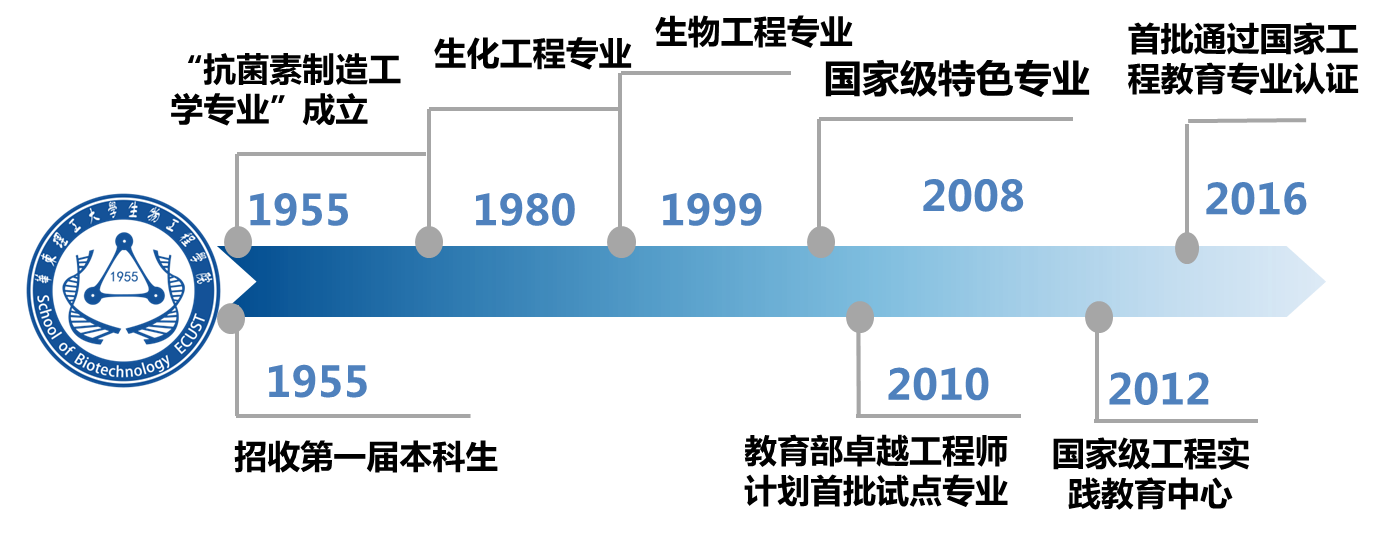 生物工程是利用生物学与工程学相结合的方法,按照人类的需要设计和改造生物的结构与功能,以便绿色、高效、经济地制造各种产品的新型学科,是生命科学从实验室研究通向工业生产的桥梁。华东理工老员工物工程专业是国家特色专业,其办学历史起源于1955年创建的“抗生素制造工学专业”,为我国化工、医药、食品等领域培养了一大批科学、工程和技术人员。随着学科的发展(如图),生物工程专业在基因工程、生物催化工程、药物开发、动植物细胞培养、发酵工程、生物产品分离纯化、生物制药工程等领域形成了科研教育相融合、理论与工程相结合的办学特色。2016年生物工程专业首批通过教育部国际工程教育标准认证(全国唯二),生物工程教育获得国际认可,显著提高员工的国际竞争力。